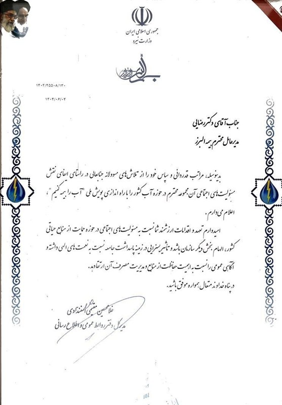 تقدیر وزارت نیرو از بیمه البرز؛ پیشگامی در پویش ملی «آب را بیمه کنیم»