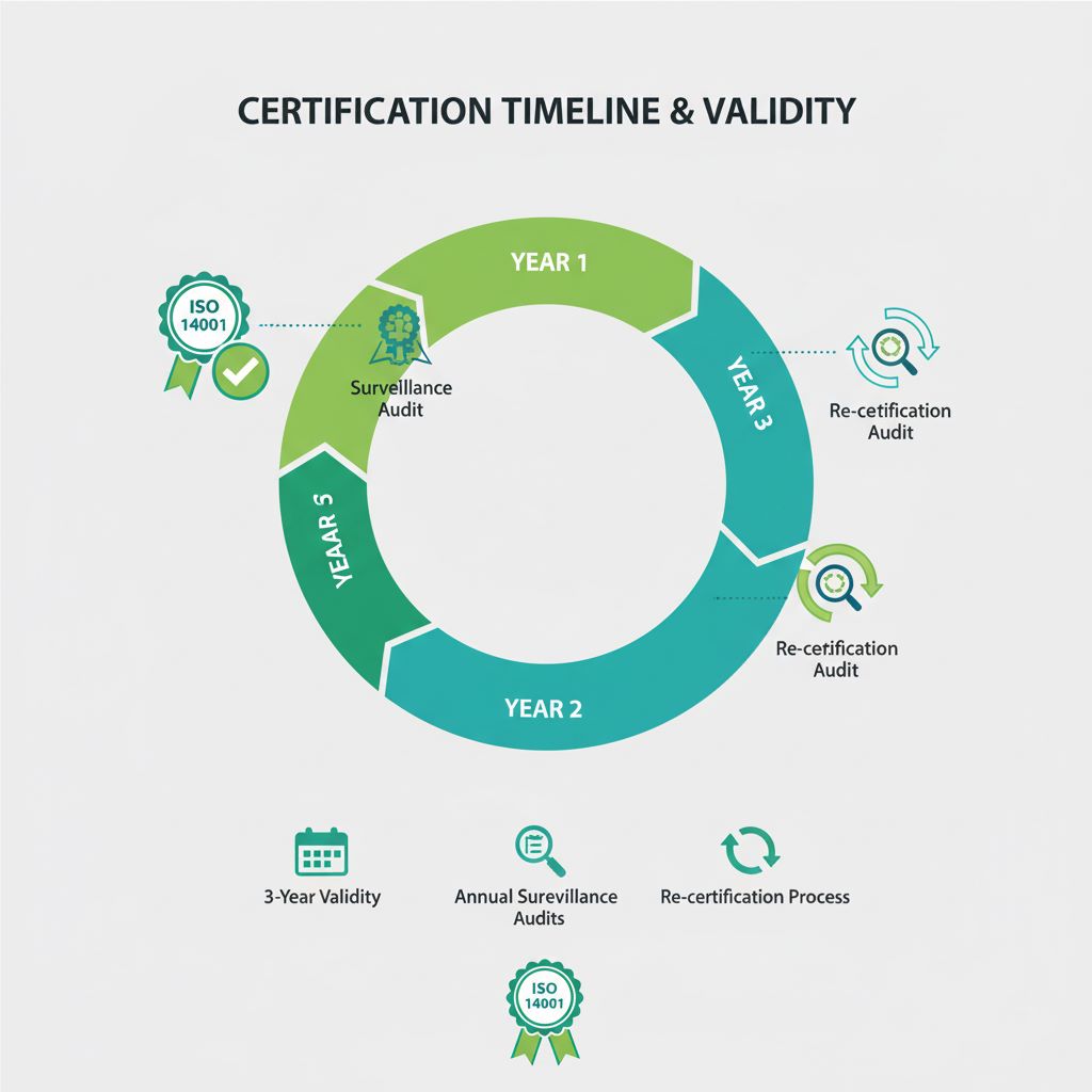 گواهینامه ISO 14001 دارای اعتبار سه ساله است. با این حال، برای حفظ این اعتبار، سازمان موظف است که به طور منظم تحت “ممیزیهای مراقبتی” (Surveillance Audits) قرار گیرد. این ممیزیها معمولاً به صورت سالیانه (یا هر شش ماه) توسط مرجع صدور گواهینامه انجام میشود تا اطمینان حاصل شود که سیستم مدیریت محیط زیست به درستی نگهداری شده، به طور مؤثر عمل میکند و بهبود مستمر در آن جریان دارد. در صورت وجود عدم انطباقهای جدی در این ممیزیها، اعتبار گواهینامه میتواند به حالت تعلیق درآمده یا لغو شود.