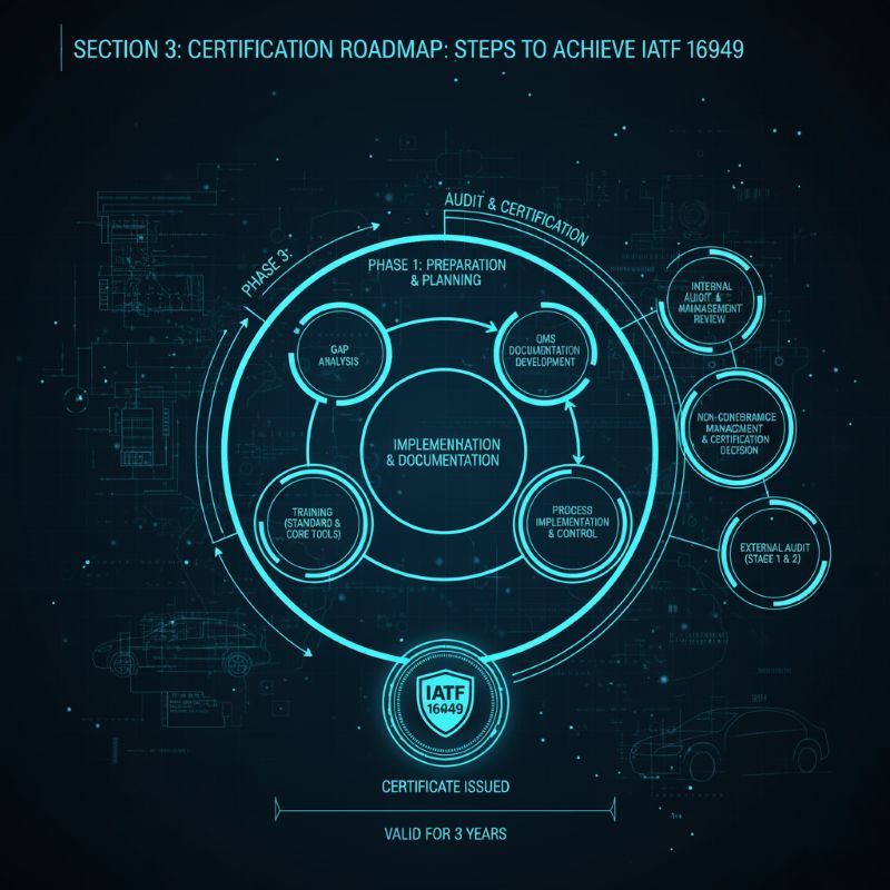 فرآیند دریافت IATF 16949 یک سفر ساختاریافته و چندمرحلهای است که نیازمند برنامهریزی دقیق، تعهد سازمانی و اجرای منظم است. این مسیر را میتوان به سه فاز اصلی تقسیم کرد: