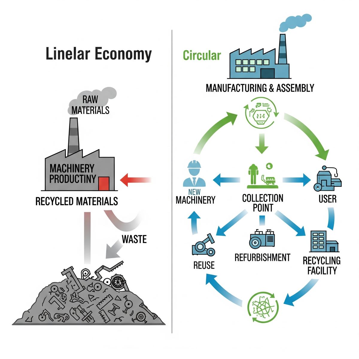 کاربرد اصول اقتصاد دایرهوار در صنعت ماشینآلات، فراتر از مدیریت پسماند در پایان خط تولید است. این رویکرد، از همان مرحله طراحی آغاز میشود و تمامی مراحل چرخه عمر یک ماشین صنعتی را در بر میگیرد.